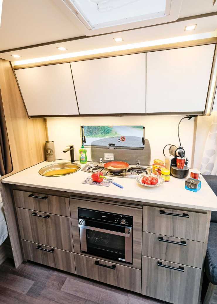 I köket finns fyra överskåp och sex utdragslådor vilket ger tillräckligt med förvaring. Dessutom finns en utdragbar skärbräda, trelågig spis med arbetsyta framför, köksfläkt, ugn (tillval) och två sophinkar för sortering. Vidare har vagnen ett högt kylskåp som också ser väldigt snyggt ut.