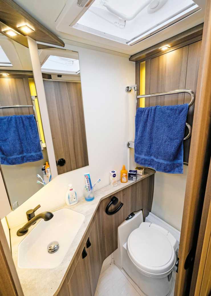 Passagen till badrummet är också ganska smal, men det bör räcka till för de flesta. Om inte, finns denna vagn också i fullbreda 2,5 meter med efternamnet King Size (KS). I den är mittgången bredare, sängen lika bred, men soffan fram större och därmed även gästbädden. Badrummet är annars tillräckligt stort och Kabe samlar poäng även här med handdukstorken som ingår i komfortpaketet.