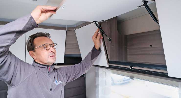 Beslag och gångjärn är i god kvalitet och dubbla gasdämpare håller luckorna perfekt stängda eller öppna. Lådorna i köket har mjukstängning och den stabila skjutdörren till badrummet och bordets saxstativ är av bra kvalitet. Centrallåset till kökslådorna är väldigt praktiskt. Det betyder att när man står uppställd på campingen är lådorna alltid lätta att dra ut utan att behöva vrida på spärrar, och inför resan kan allt låsas enkelt och snabbt.