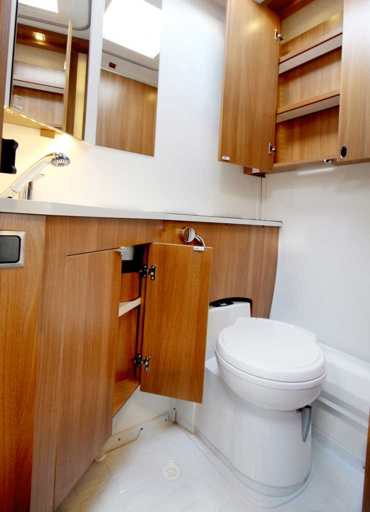 Sängen lyfts upp med hjälp av två stabila gasfjädrar och under hittar man ett välplanerat förvaringsutrymme, med måtten 159x110x33 centimeter. Utrymmet skulle dock behöva en lucka även på utsidan i bakre hörnet, men pannans rörsystem erbjuder ingen enkel lösning. Toaletten är placerad i vagnens högra bakhörn. För att maximera utrymmet är det utrustat med en skjutdörr. Duschen är integrerad i tvättställets kran. Även i denna del av vagnen finns det gott om förvaringsutrymme.
