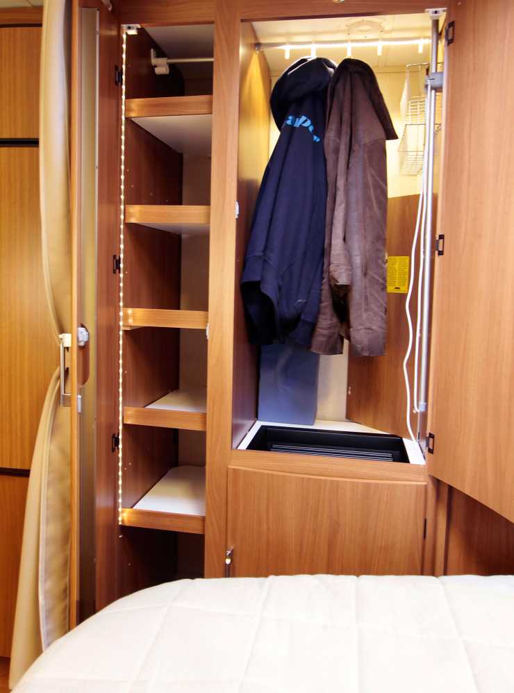 Den andra garderoben är större, det mäter 56x56x127 centimeter. Skåpet är utrustat med en automatisk LED-lampa. Det kan även användas som torkskåp. Under garderoben finns Aldepannan. Den har fått en egen lucka av estetiska skäl. Tidigare hade garderoben och pannan en gemensam dörr. Royals standardutrusting innefattar även AGS II Pro golvvärme. Bäddens storlek är 196x148/109 centimeter. Ovanför den finns fem överskåp med luckor med gasfjädrar. Skåpen skulle gärna kunna vara djupare än 20 centimeter, eftersom risken att slå huvudet i underdelen av skåpen är låg. I fotändan av bädden finns två effektiva LED-lampor och tre strömbrytare med vilka man släcker lamporna i vagnen när det är sovdags.