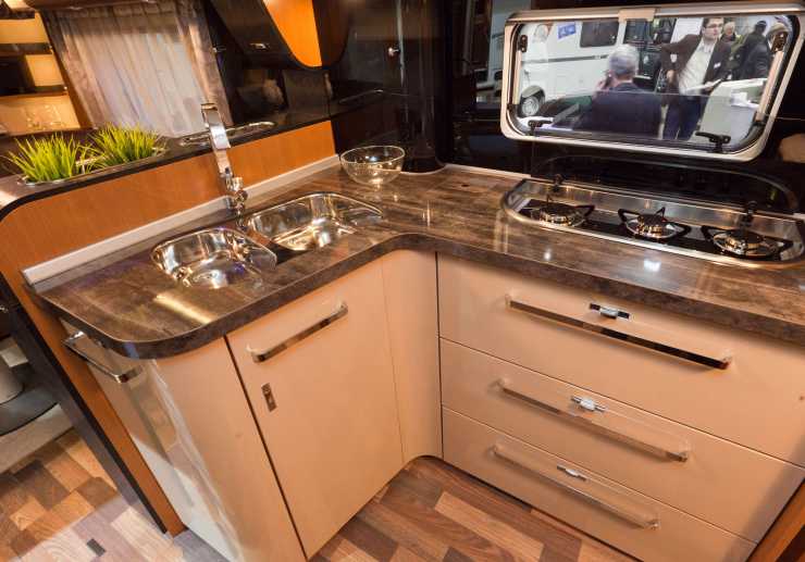 Framåt i vagnen finns ett kök på höger sida och hygienutrymmet till vänster följt av en garderob samt långbäddarna. Det raka köket har en trelågig spis. Under bänkskivan finns kylskåp och tre rejäla lådor med softclose funktion. Inne i hygienutrymmet som är relativt rymligt finns en toalett med vridbar sits, förvaring i olika former, ett frostat fönster samt en rejäl spegel.