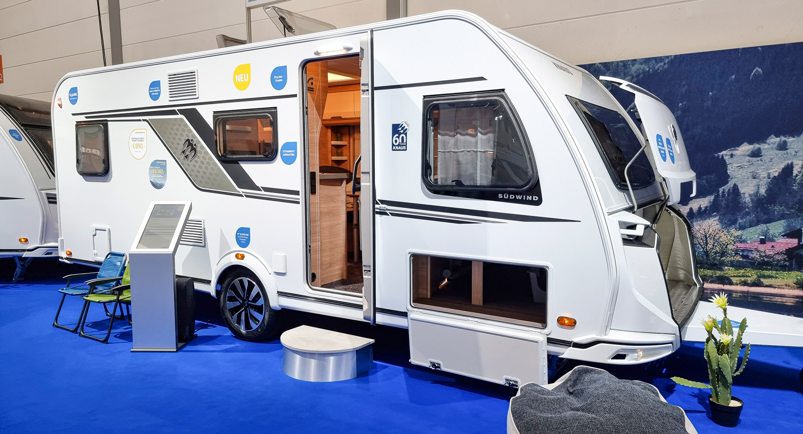 De färgglada klistermärkena är bara infoskyltar på mässexemplaret. Normalt är det en diskret och modernt designad husvagn. Kanske lika tidlös som namnet Südwind.