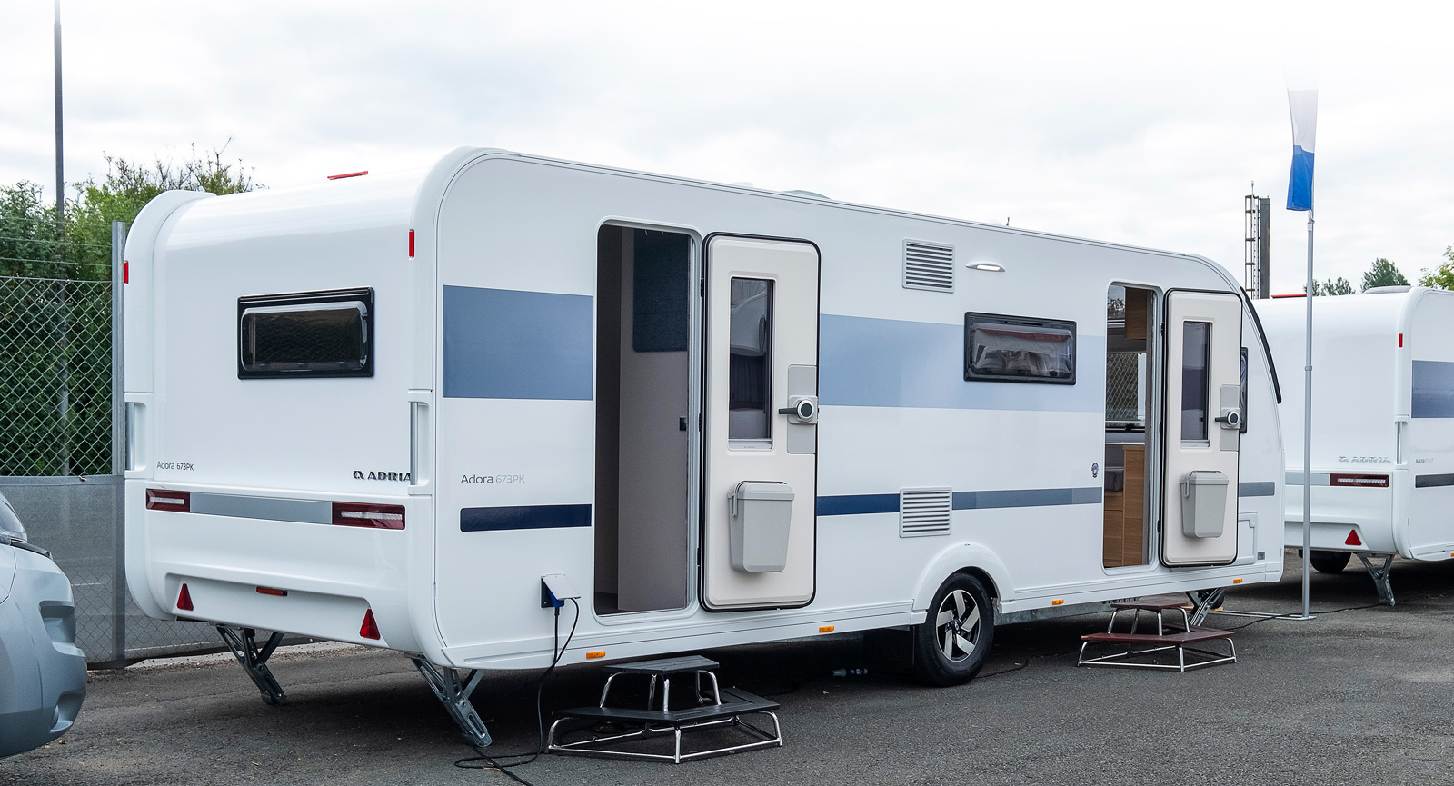 Tänk om tonåringar kunde smyga ut från husvagnen utan att väcka föräldrarna! Nu är det möjligt tack vare Adria Adora 673 PK som har en extra entré. Häng med in i en enkelaxlad familjehusvagn med sju bäddar och dubbla ytterdörrar!