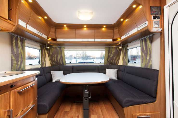 Klassisk. Rymlig och bekväm u-soffa längst fram i vagnen. De kan lyftas för enklare städning.