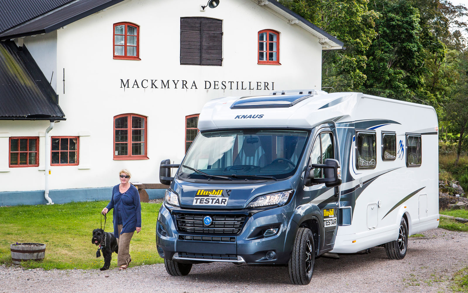 Knaus utbud 2015 innefattar allt från kompaktbilar till helintegrerade modeller. Sky Ti är en serie halvintegrerade bilar utan taksäng och dubbelgolv vilket gör att höjden med råge håller sig under tre meter. Vi tar en pinfärsk bil på tur i trakterna runt Gävle där bilen står hos Husvagnscenter i Valbo. Planlösningen är en av de populäraste just nu med låga långbäddar och hygienutrymmet längst bak.