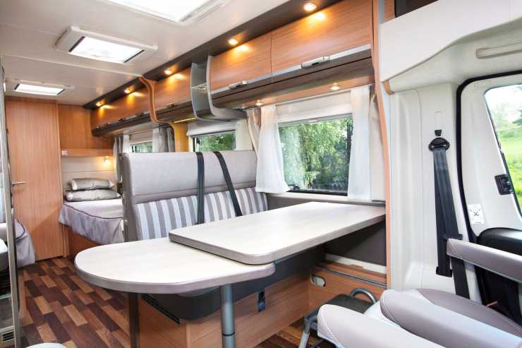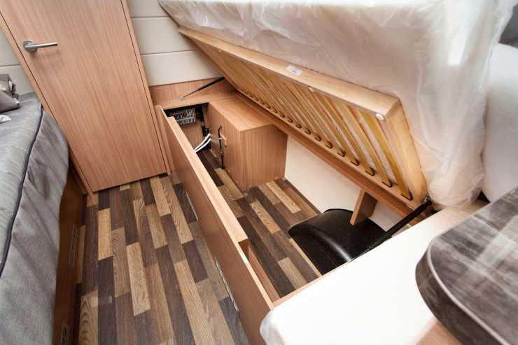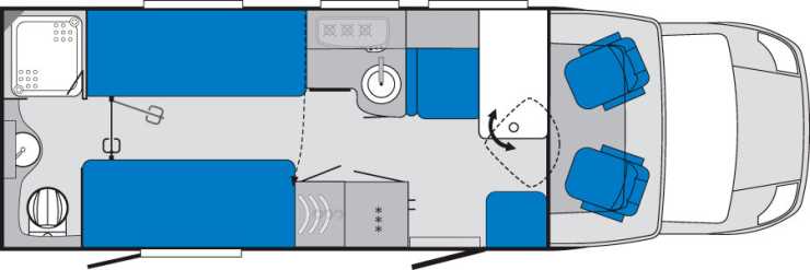 Bakom förarhytten finns en rak soffa som även utgör de bakre färdplatserna. Direkt innanför bodelsdörren finns ytterligare en sittplats i vars ryggstöd tv:n finns och kan dras upp vid tittbehov. Matbordet är vägghängt och har en förlängningsskiva så att alla kan nå. Vi sitter bekvämt men lite väl rakt i ryggen i soffan. Vid sittgruppen finns ett tekniskt dubbelgolv som först och främst hyser diverse teknik men även ett grunt förvaringsutrymme under en av luckorna. Köket är en trevlig bekantskap. Ett avlångt fönster ger ljus och utsikt. Den avlånga spisens tre lågor ligger på rad under fönstret vilket ger gott om arbetsyta framför. Diskhon är rund och ganska liten men det ger avställningsyta runt den istället. En annan yta som kan komma väl till pass finns mellan sittgruppen och köket. Under diskhon finns ett skåp med två rejält tilltagna trådbackar som kan dras ut vilket ger bra överblick. Bilens hall har plats för skor och till vår stora glädje finns det några klädkrokar direkt innanför dörren. Intill finns kylskåpet och bredvid det bilens enda höga garderob. Efter det följer de låga långbäddarna som har olika längd (se faktaruta) Sängarna kan resas och under finns det gott om plats, på den högra sidan av bilen finns även en utvändig lucka till detta utrymme. Mellan sängarna och köket kan en tunn jalusi av pappersliknande tyg dras för. Den går inte hela vägen ner till golvet mellan sängarna så helt privat känns det inte vilket är vanligt i bilar med denna planlösning. Längst bak i bilen finns det tvärställda badrummet som är riktigt rymligt och erbjuder mycket avställningsytor. Förvaring finns det gott om runt handfatet.