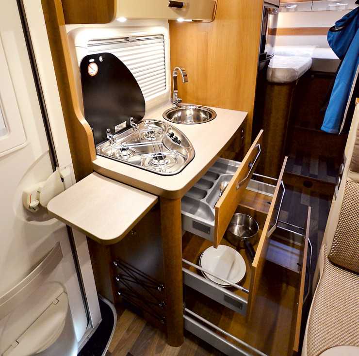 Provbilens kök är utrustat med ett 190-liters kylskåp från Thetford med separat frysfack. Detta är dock tillval, då standard är 108 liter. I övrigt är utrustningen typisk för klassen. Köksbänkens storlek är 58x94 centimeter, men den kan förlängas med en uppfällbar bordsskiva på 25x34 centimeter. Det finns tre lådor och överskåpet har en enda bred lucka. Sittgruppen rymmer fyra personer. Soffans dynor känns hårdare än vanligt och bredden är blygsamma 90 centimeter. Ovanför bodelsdörren finns Knaus välbekanta kontrollpanel, men kontrollenheten för Truma är ny. Den kräver lite tillvänjning men man känner sig snabbt hemmastadd. Hallen saknar garderob och det finns heller inte någon plats för en sådan. Knaus har dock löst skoförvaringen genom att placera en lättstädad plastlåda mellan passagerarstolen och väggen. Sikten vid färd är bra åt alla håll och tillvalsfönstret i bodelsdörren hjälper till vid trånga passager. Agutistolarna är bekväma och funktionella. Ljudisoleringen mot motorrummet kunde dock varit bättre. Speglarna är välplacerade, men den nedre vidvinkeldelen är inte elmanövrerad.