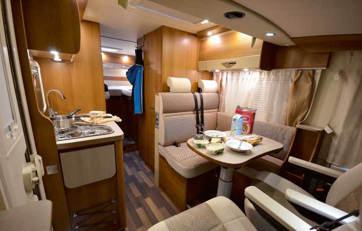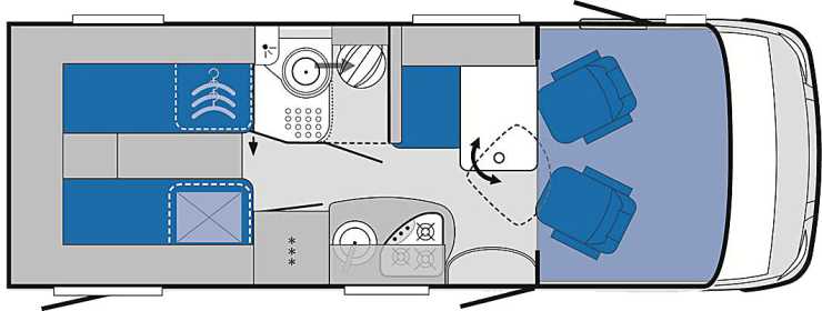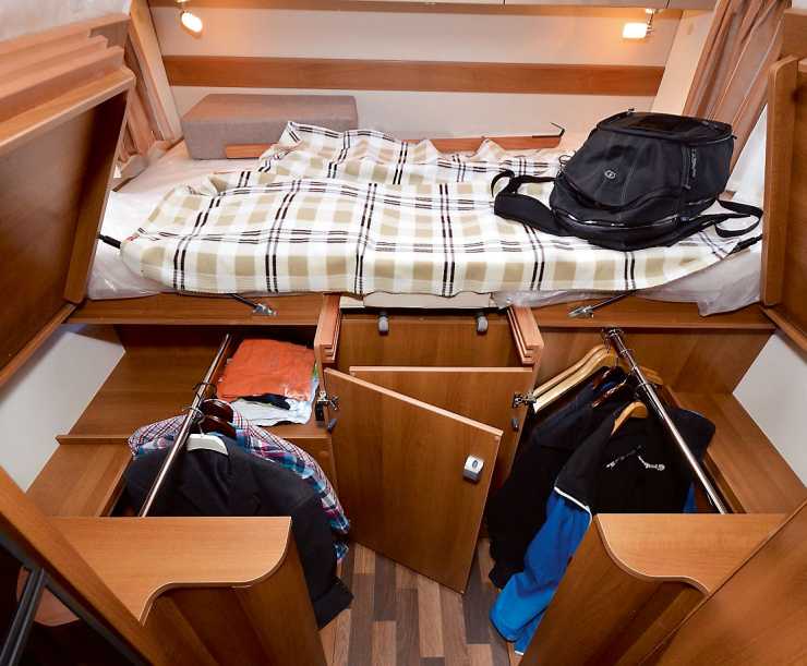 När man stiger in i bilen, märker man knappt av att den har blivit smalare. Det smalaste stället mellan köket och soffan är 48 centimeter, vilket trots allt är en rimlig bredd. När man går in i sovdelen fastnar blicken på garderoberna under sängarna. De är åtkomliga både genom att lyfta upp sängarna och genom en lucka i mittgången. Utrymmena är välplanerade med en stabil klädstång och många hyllor. I övrigt är sovdelen i stort sett likadan när det gäller design och utrustning, som i en ”fullstor” variant. Vid bakväggen finns tre överskåp med stabila luckor. Sängarnas mellandel är bara 33 centimeter bred och madrassen är hård. Trappstegen är utdragbara och lättanvända. Sitthöjden på 80 centimeter får godkänt betyg. Mellan de separata enkelbäddarna i bakdelen finns en betydligt kortare del, men sängarna är i sig tillräckligt breda.