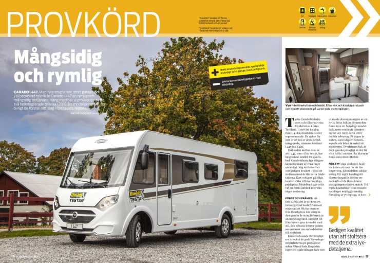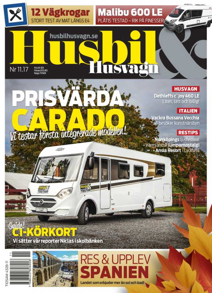 Helintegrerade Carado i447, Malibu Van, 600 LE och vagnen Dethleffs c`joy. Resor till konstnärsby i Italien, Segovia i Spanien, testade vägkrogar längs E4 och lumparnostalgi i Värmland samt allt du vill veta om C1-kort och mycket mer.