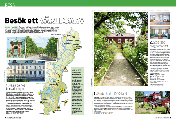 Unika platser. Runtom i världen finns cirka tusen platser som anses vara så enastående att de är av stor betydelse för hela mänskligheten. I Sverige finns 15 av dessa så kallade världsarv. Kanske något för den envetne att pricka av under kommande semestrar?