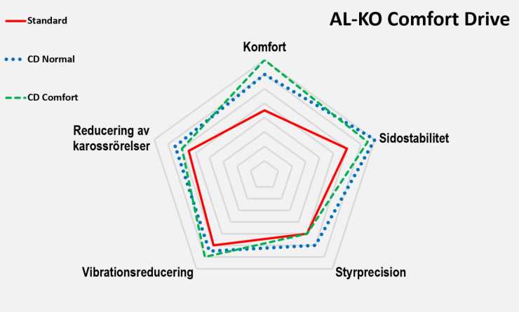 Enligt AL-KO:s eget diagram sker förbättringar mot alla parametrar jämfört med MB Sprinterns standarddämpare. Här syns skillnaden mellan standarddämpare (röd heldragen linje). Samt de två lägena "CD Comfort" och "CD Normal". Sidostabilitet och styrprecision i normalläget samt komfort i Comfort-läget ser ut att ge stor skillnad. Vi får återkomma med tester.