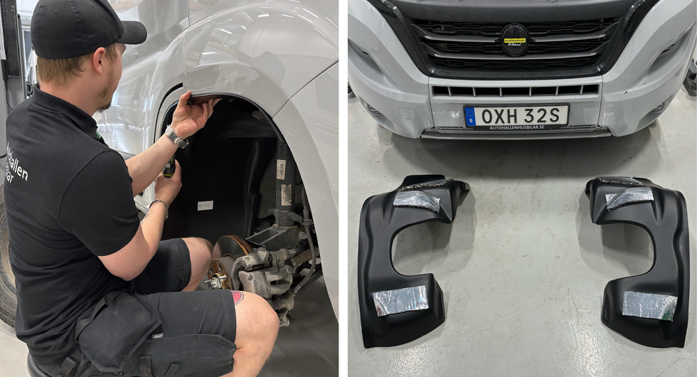Att innerskärmar inte ingår på husbilar i miljonklassen kan man ha sina åsikter om. Nu har vi det i alla fall på redaktionens plåtis. Dessutom med stänkskydd.