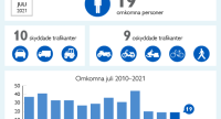 Fortsatt få omkomna i trafiken Nyheter 18 augusti 2021 Under juli 2021 omkom 19 personer i trafiken visar de preliminära uppgifter som inkommit till Transportstyrelsen fram till den 16 augusti 2021. Det är lika många omkomna jämfört med motsvarande månad 2020. Gasa